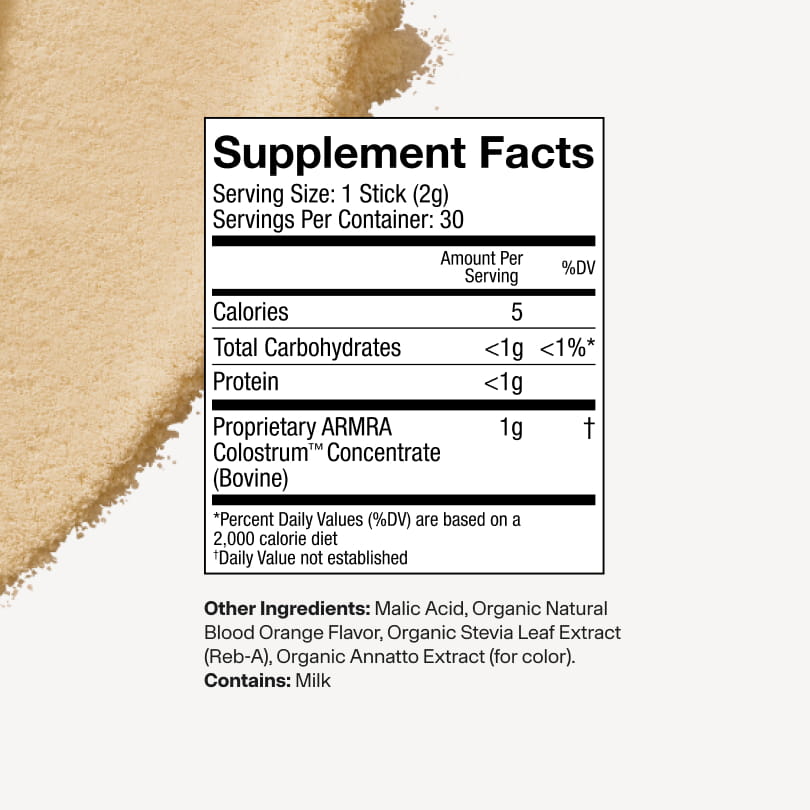 Blood Orange: Proprietary ARMRA Colostrum Concentrate (Bovine), Organic Natural Blood Orange Flavor, Citric Acid, Organic Stevia Leaf Extract, Organic Annatto Extract (for color). Contains: Milk.