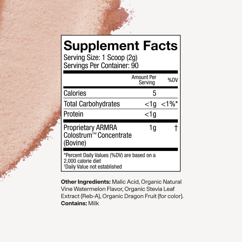 Vine Watermelon: Proprietary ARMRA Colostrum Concentrate (Bovine), Malic Acid, Organic Natural Watermelon Flavoring, Organic Stevia Leaf Extract, Dragon Fruit (Hylocereus undatus) (for color). Contains: Milk.